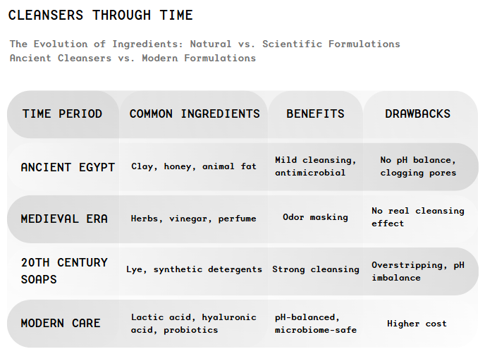 Cleansing has evolved drastically throughout history, shaped by cultural beliefs, scientific discoveries, and advancements in skincare technology. While ancient civilizations relied on natural ingredients and rituals, modern hygiene is driven by microbiome science, dermatology, and pH-balancing cleansers.